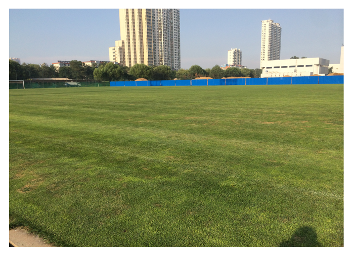 兩個(gè)球場(chǎng)對(duì)比明顯:其中一個(gè)球場(chǎng)使用優(yōu)繪三次,幾乎沒有病斑;另一個(gè)球場(chǎng)使用優(yōu)繪一次,正在發(fā)生腐霉病和夏季斑病,病斑較為明顯。