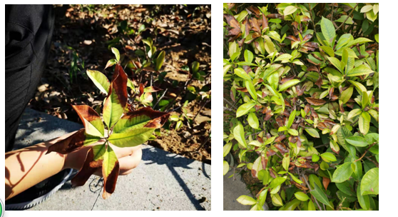 北方地區(qū)日照強度大,空氣濕度相對較較低,日灼現(xiàn)象十分明顯,紅葉石楠葉片邊緣受高溫影響大量失水導(dǎo)致葉片皺縮卷邊,開始枯黃,嚴重影響景觀效果。