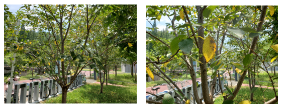 除此之外,筆者觀察到,長三角地區(qū)許多早櫻在受到高溫脅迫,出現(xiàn)樹勢衰弱、葉片枯黃的情況,各種病菌侵入,嚴重的出現(xiàn)了葉片穿孔。