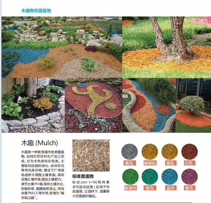 有機(jī)覆蓋物:是利用各種有機(jī)生物體材料,通過(guò)各種生產(chǎn)工藝,加工處理后鋪設(shè)于園藝植物或樹(shù)木周圍的土壤表面,起保持土壤水 分、吸附揚(yáng)塵、調(diào)節(jié)土壤溫度、增加土壤肥力、抑制雜草、促進(jìn)植栽生長(zhǎng)、減少土壤侵蝕和緊實(shí)度以及裝飾美觀等等作用。(如下圖)