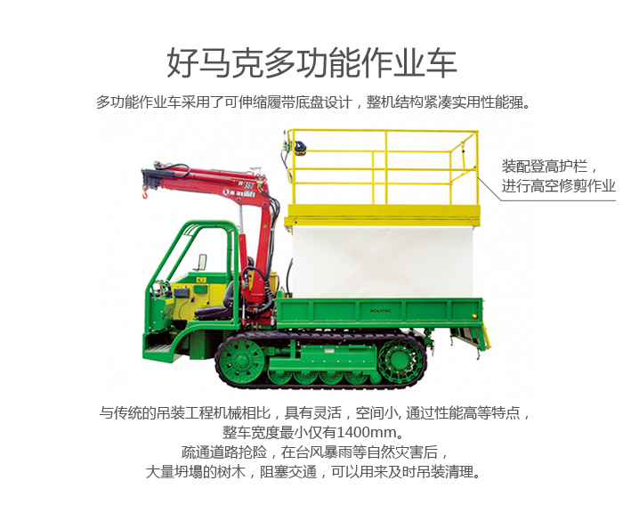 多功能作業(yè)車采用了可伸縮履帶底盤(pán)設(shè)計(jì),整機(jī)結(jié)構(gòu)緊湊實(shí)用性能強(qiáng)。與傳統(tǒng)的吊裝工程機(jī)械相比,具有靈活、空間小、通過(guò)性能高等特點(diǎn),整車寬度最小僅有1400mm。同時(shí),履帶式底盤(pán)對(duì)地面的要求也很低,不用考慮地基的要求。