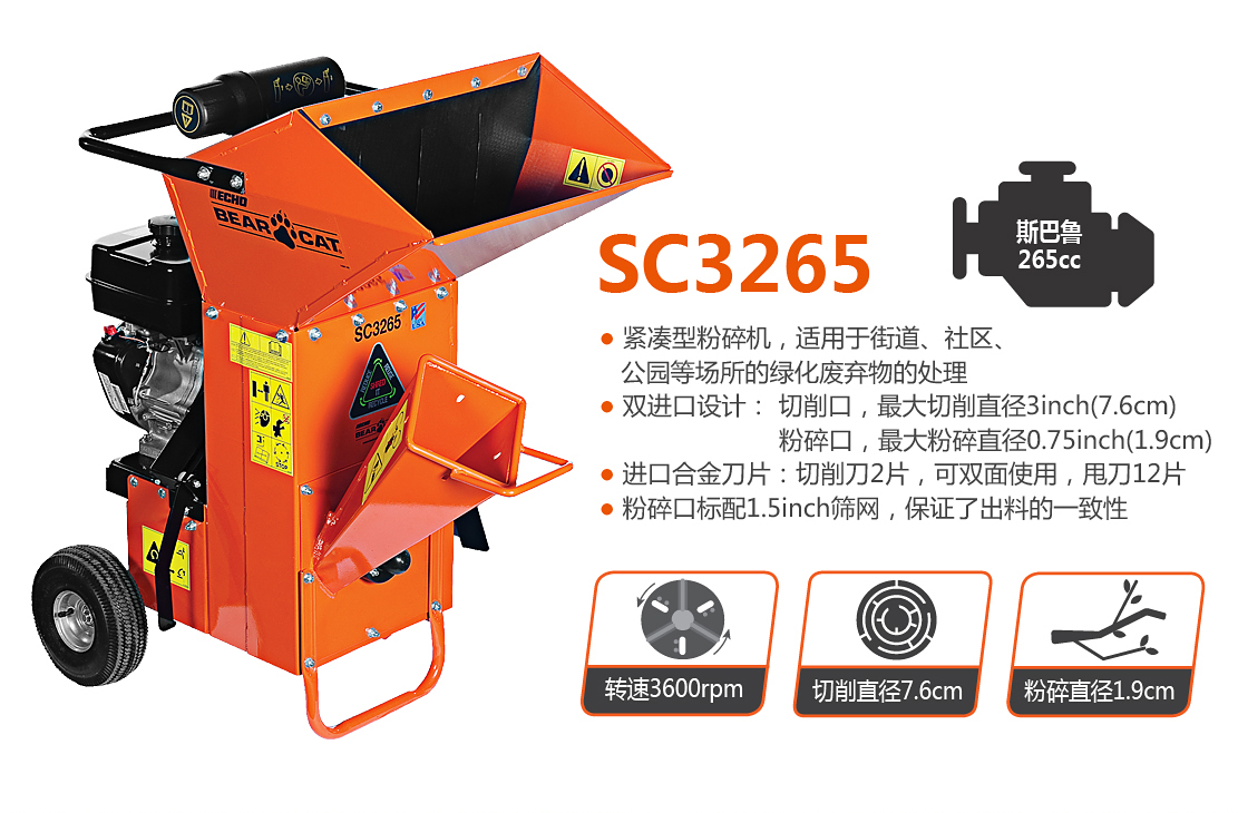 老熊(BEARCAT)品牌小型粉碎機(jī),配置斯巴魯265cc發(fā)動(dòng)機(jī),擁有切削、粉碎兩個(gè)進(jìn)料口,以及可更換出料篩網(wǎng),最大可以切削3英寸(7.5cm)枝椏。體積小,操作靈活,適用公園、廣場、物業(yè)等多種區(qū)域。